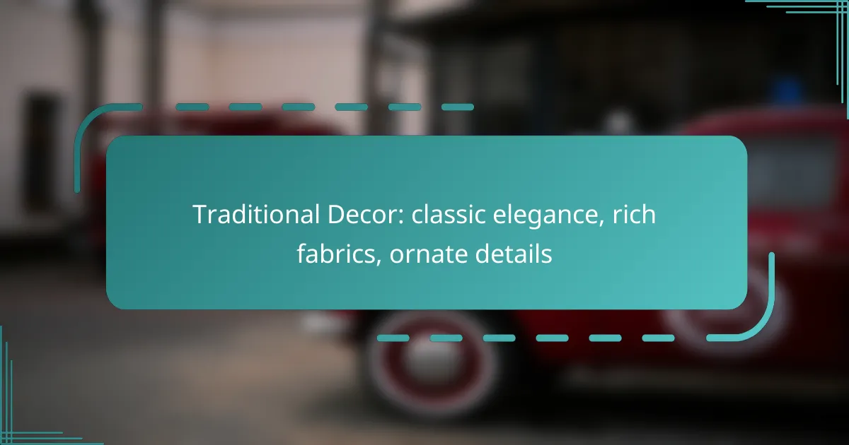 Traditional decor embodies classic elegance through the use of rich fabrics and ornate details, creating a timeless aesthetic that enhances any space. By incorporating elements such as intricate patterns and balanced layouts, this style reflects a deep appreciation for heritage and craftsmanship. Embracing traditional decor allows for the creation of sophisticated interiors that evoke a sense of history and refinement.